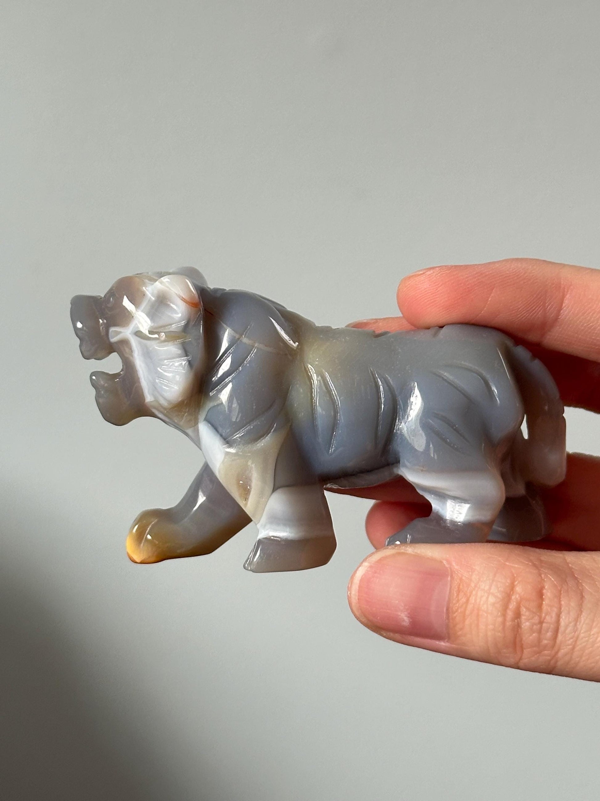 This powerful little tiger is carved from beautifully banded agate, with natural stripes and swirls that echo the strength and grace of the animal it represents. Each piece is one-of-a-kind, with unique earthy tones and layered patterns formed over time. A wonderful display of nature's artistry, this tiger makes a striking desk or shelf companion.