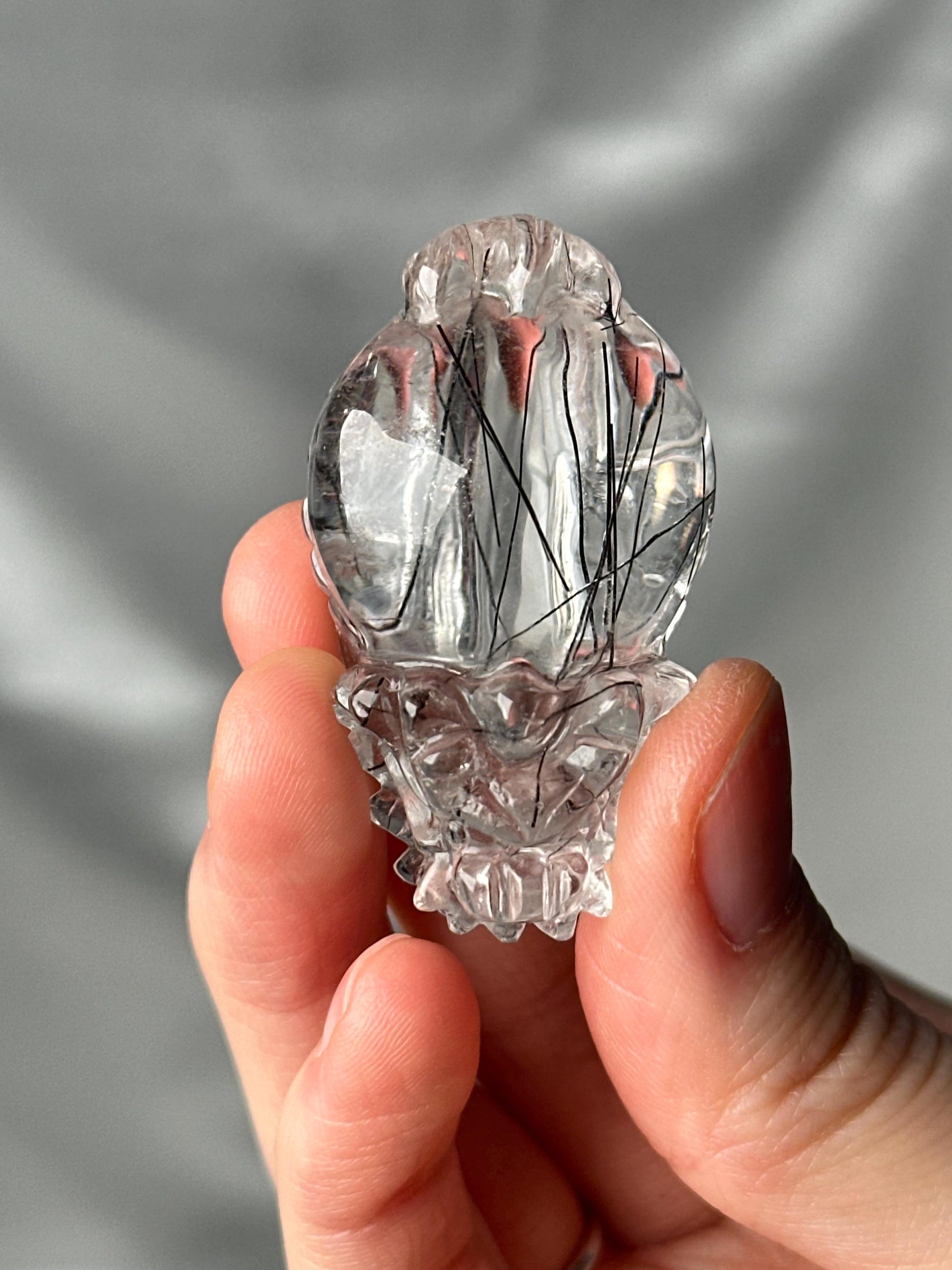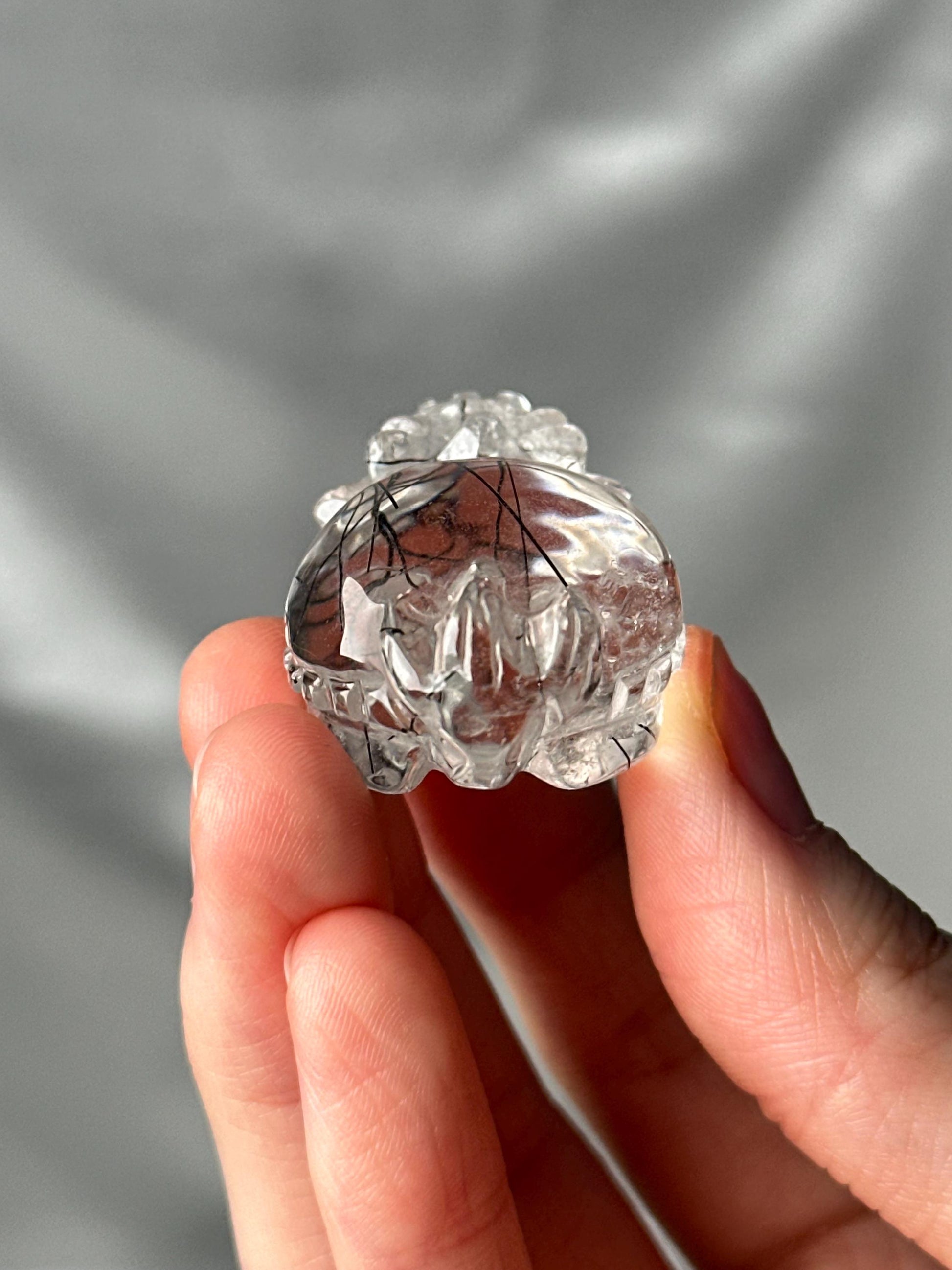This Lóngguī carving features clear quartz naturally included with black tourmaline, creating striking contrast between the transparent crystal and dark, thread-like inclusions. The combination highlights both the clarity of quartz and the grounding presence of tourmaline, while the dragon turtle form symbolizes strength, protection, and stability.