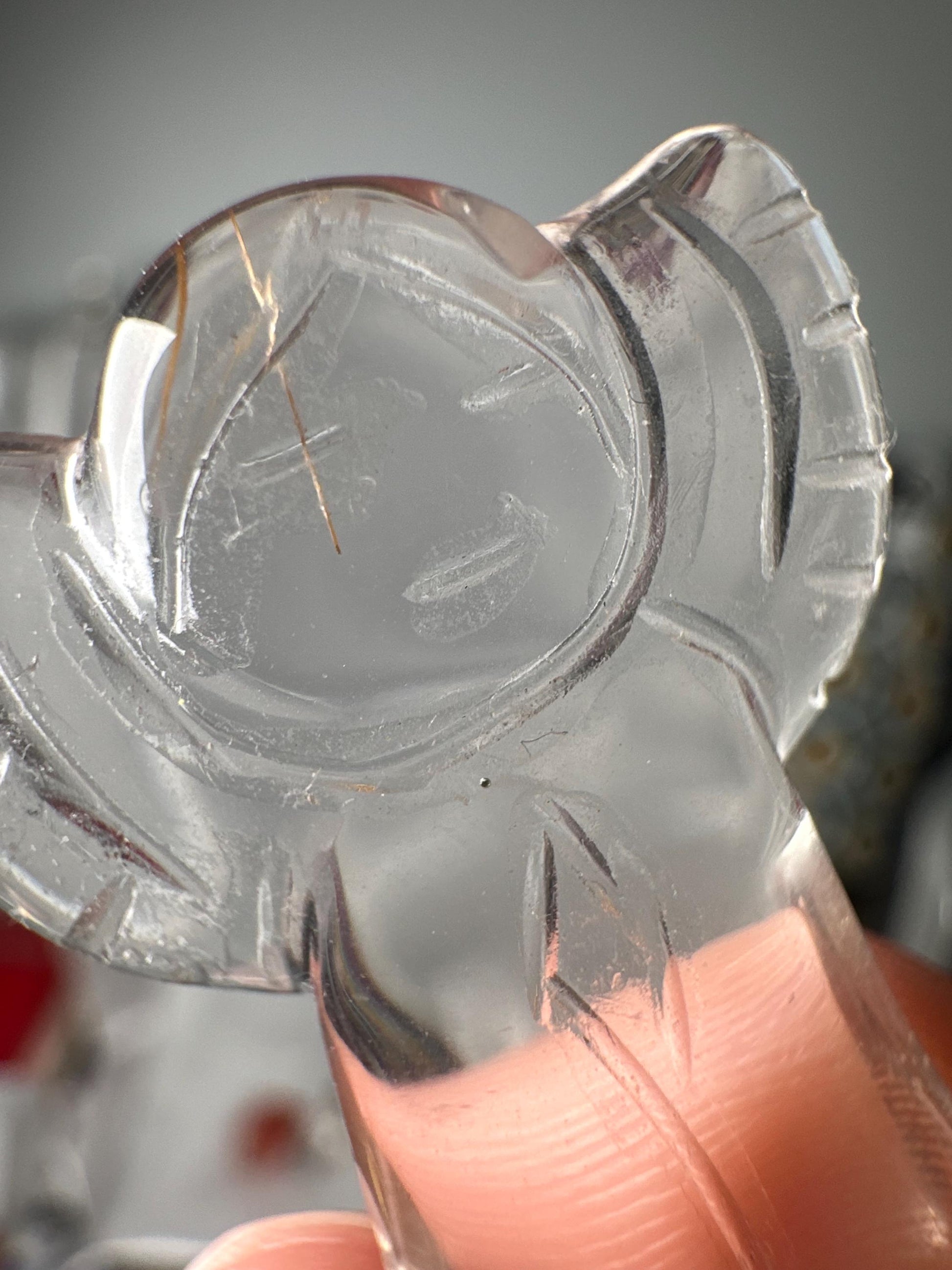 This mini clear quartz angel is hand-carved by Brazilian artist Leandro de Souza, known for his refined craftsmanship and attention to detail. The clear quartz has a bright, clean appearance that allows light to move through the carving, highlighting subtle natural inclusions. Its small size makes it easy to keep on a desk, altar, or carry with you. Has small strand of rutile & does not self stand.