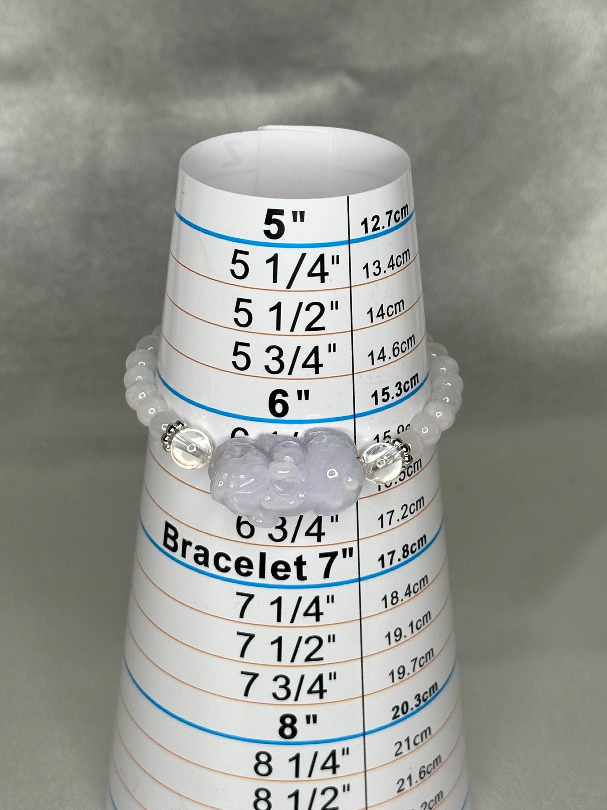 This bracelet features Lavender Jade, a stone admired for its soft lilac hue and tranquil energy. Its gentle color radiates serenity and emotional balance, making it a beautiful companion for everyday wear. The centerpiece-a Lavender Jade Pixiu bead-adds a symbolic touch of prosperity, protection, and luck, as Pixiu is regarded in Chinese tradition as a guardian of wealth and good fortune.