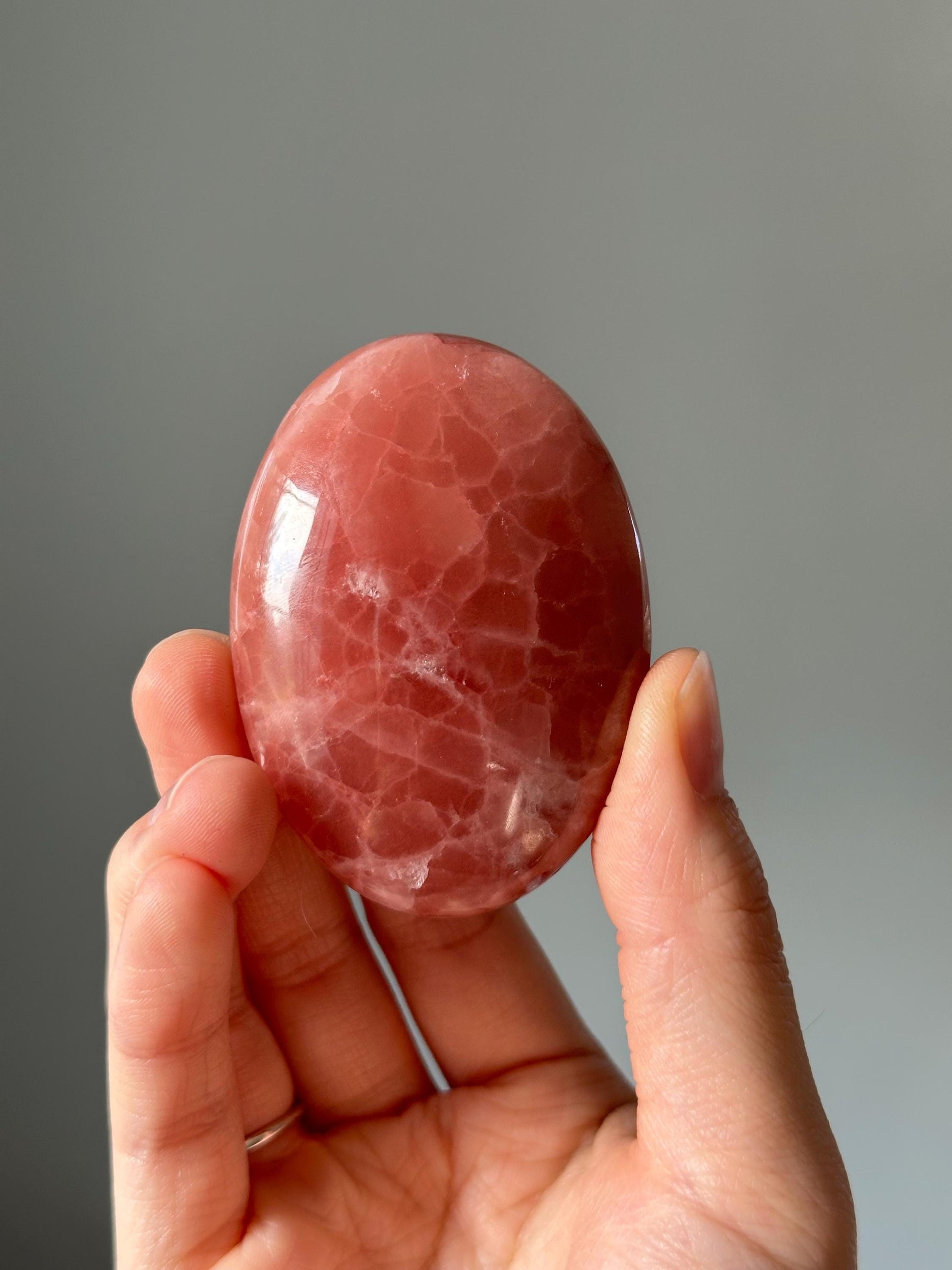 This soft, blushing pink stone has a gentle glow that feels comforting and warm in the hand. Its smooth surface and calming presence make it a soothing piece to hold during moments of reflection or rest.